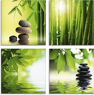 Artland Glasbilder Wandbild Glas Bild Set 4 teilig je 20x20 cm Quadratisch Asien Wellness Zen Spa Steine Bambus Steinpyramide Entspannung S6BJ