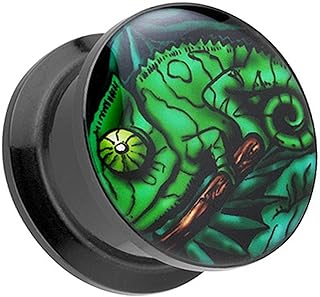 Ohr Plug Flesh Tunnel Piercing Ohrpiercing Kunststoff Schraub Schraubverschluß Picture mit grünes Chamäleon Iguana Motiv