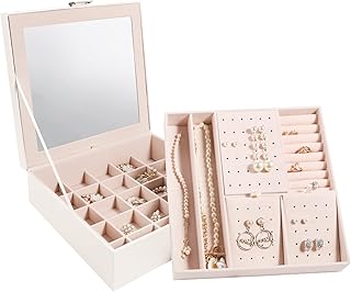 Tikea Schmuckkästchen - Schmuckkästen Groß mit Spiegel, Schmuckbox mit 2 Ebenen, Schmuckkoffer Damen Ohrringhalter Schmuckaufbewahrung Schmuck Organizer für Ringe, Armbänder, Ohrringe