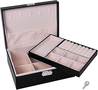 Schmuckkästchen Schmuckkoffer Leder Schwarz 2-Lagiger Abschließbar Schmuckkästen Schmucklade Aufbewahrungsbox für Ohrringe Armbänder Ringe Uhren Schmuckkästen Samt für Damen Mädchen Herren