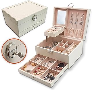 BESTATI Schmuckkasten, Schmuckkästchen groß und abschließbar, Schmuck Box mit Spiegel, Schmuckkoffer Damen 2 Ebenen, Schmuckbox mit Schubladen, Beste Geschenk für Mädchen elegant und klassisch (Weiß))